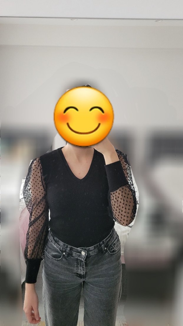 Siyah, puantiyeli uzun tül kollu, V yaka kalıp oturan kadın bluz. Rahat günlük kullanım için uygundur.