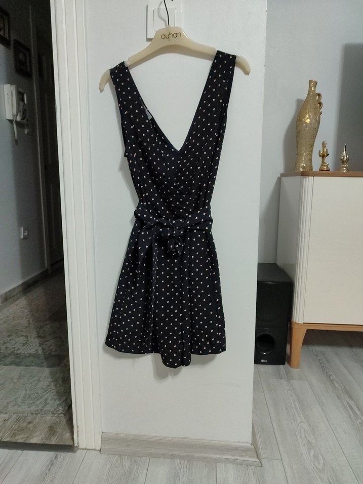 Siyah puantiyeli kısa tulum, V yaka ve ince askılıdır. Belinde kemer ile şekillendirilmiş, sentetik kumaştan üretilmiştir. Günlük sokak stili için uygundur.