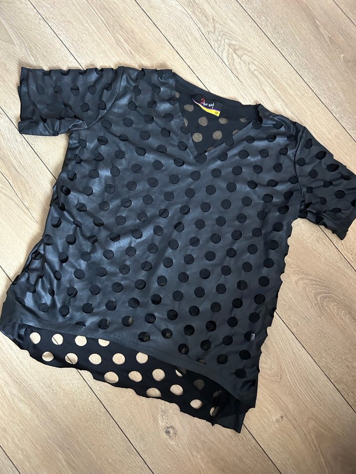 V yaka ve kısa kollu, puantiyeli desenli, düğmeli siyah bluz. Rahat kesimli, yumuşak sentetik kumaştan, günlük kullanıma uygun.