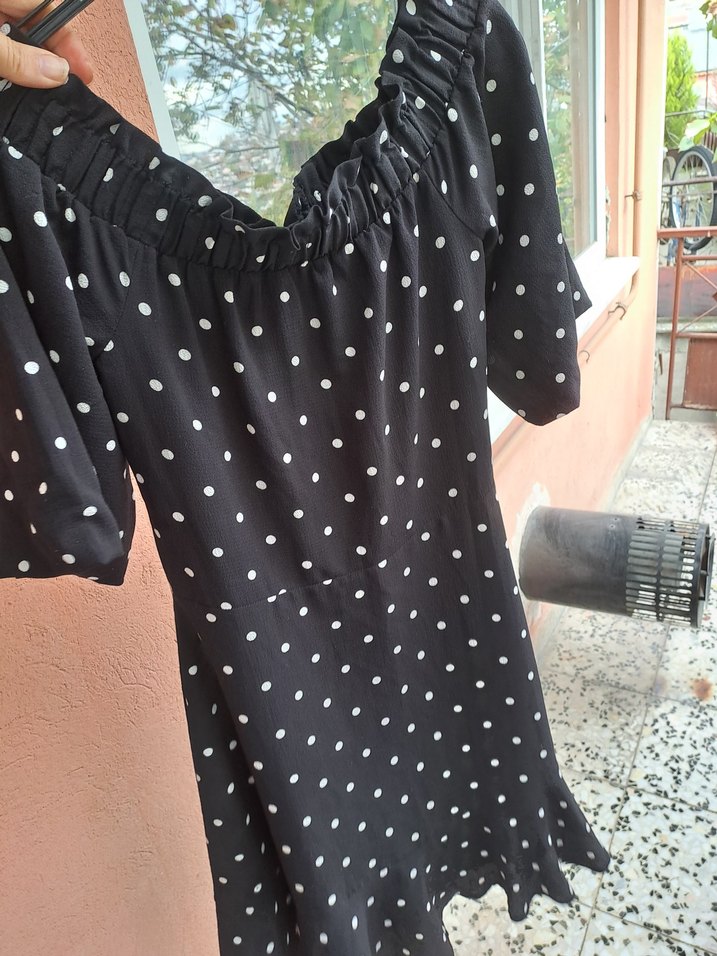 Siyah puantiyeli midi elbise, V yaka ve kısa kollu, vücuda oturan kesime sahip. Sentetik kumaştan, fırfır detaylı, günlük rahat şıklık için ideal.