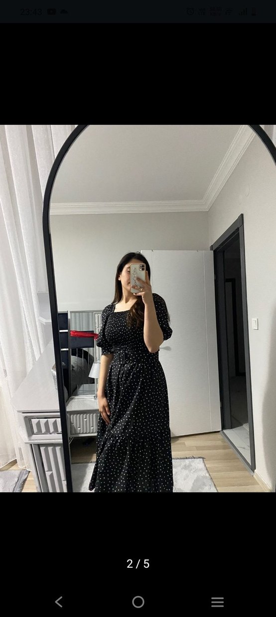 Siyah puantiyeli midi elbise, kısa kollu ve V yakalıdır. Rahat sentetik kumaştan, günlük kullanım için şık ve rahat bir seçenektir.