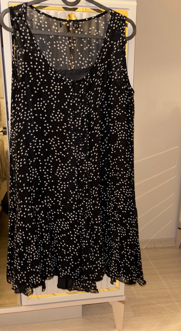 Siyah üzerine beyaz kalp puantiyelerle süslenmiş, kolsuz, V yakalı, volan detaylı mini elbise. Rahat kesimli ve yumuşak sentetik kumaştan üretilmiştir. Uçuş uçuş. 36-40 beden arasına rahatlıkla olur. Şifon elbisenin içinde astarı mevcuttur.