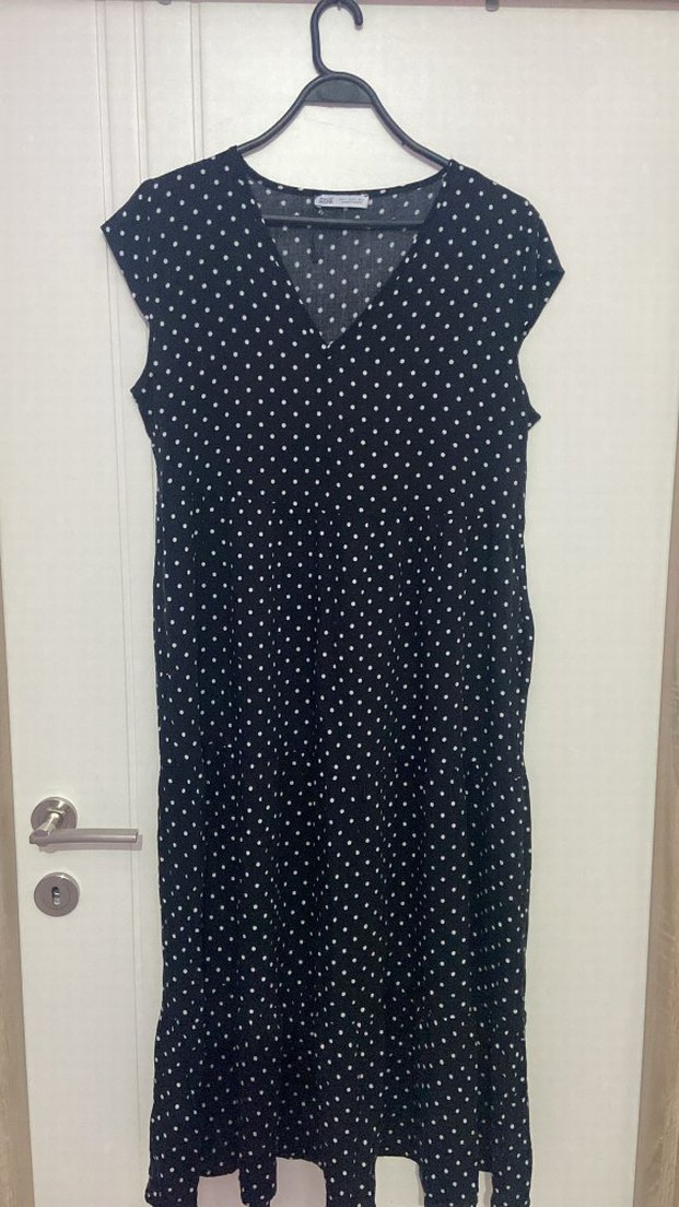 Siyah zemin üzerine beyaz puantiyeli, V yakalı ve kolsuz midi elbise. Rahat kesimi ve etek ucundaki fırfır detayıyla günlük kullanıma uygun.