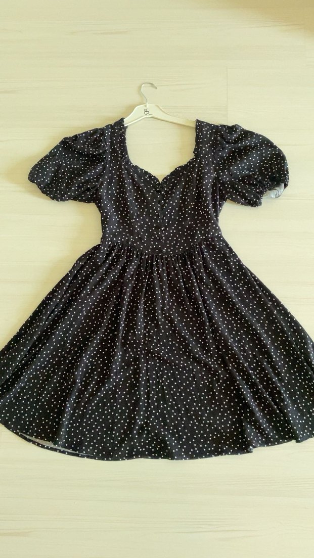 Siyah puantiyeli, V yakalı, kısa balon kollu, düğmeli ve bol kesim midi elbise. Yumuşak sentetik kumaştan, vintage tarzda, parti için uygun.