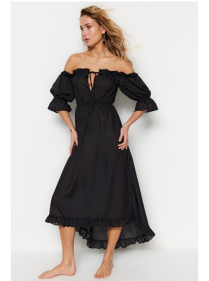 Siyah, puantiyeli uzun elbise, straplez yaka ve volan detaylarına sahip. Bol kesim ve askılı kollu, romantik akşamlar için ideal.