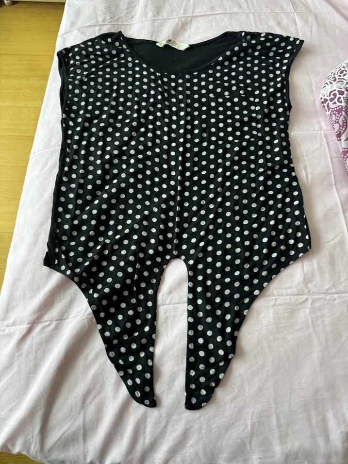 siyah renkte beyaz puantiyeli, kolsuz, sentetik kumaştan yapılmış, normal midi uzunlukta, sokak modasına uygun bluz.belden bağlamalı