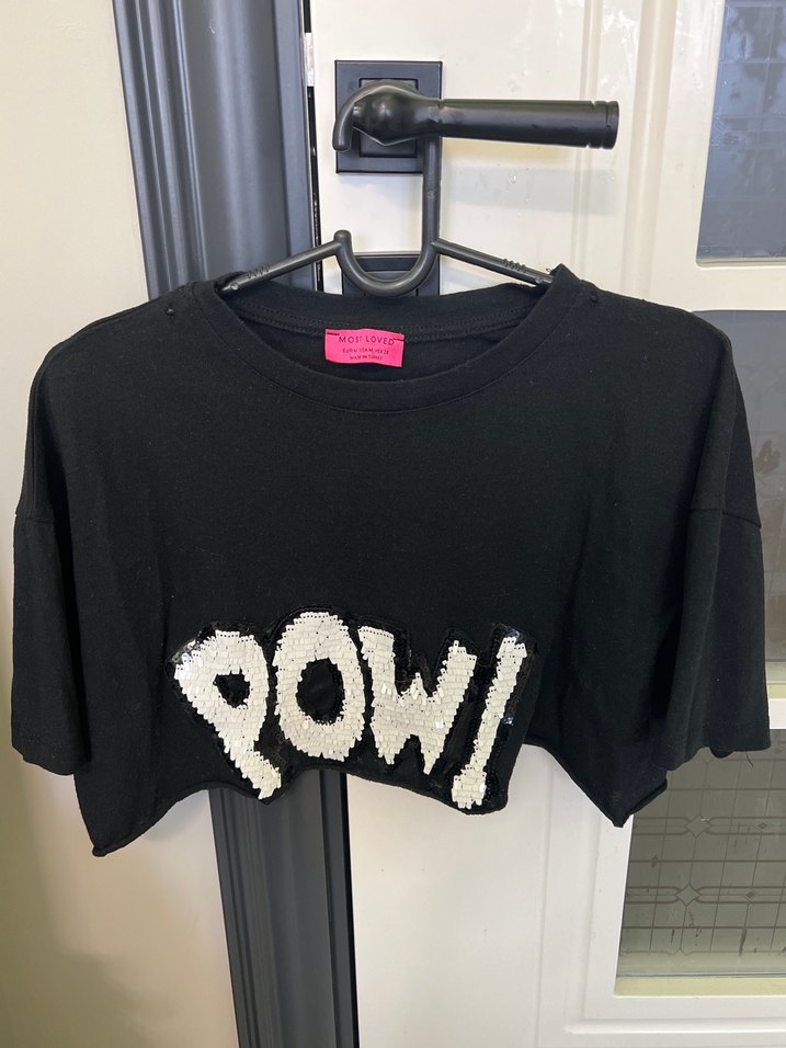 Siyah yün kumaştan, puf kollu ve bisiklet yaka crop top. "POW!" baskılı, bol kesim ve sokak modasına uygun. Spor için ideal. ⚡