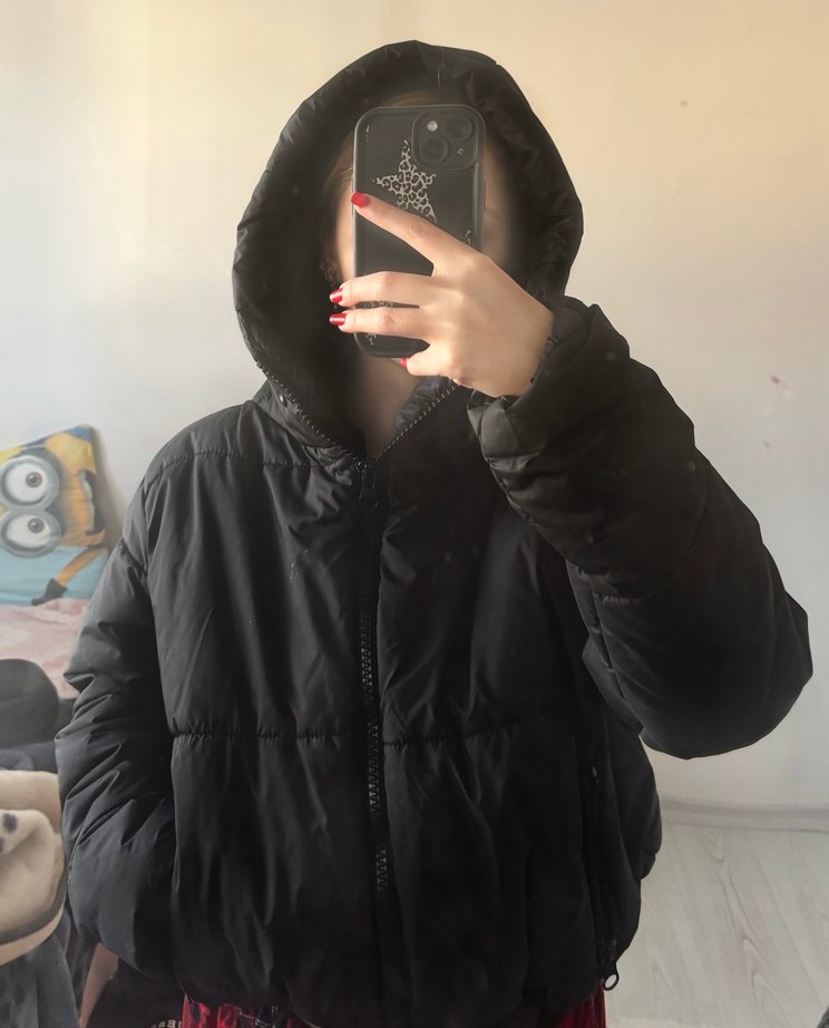 Siyah, yüksek yakalı ve uzun kollu puff mont s xs Çoğu teklifi kabul ediyorum