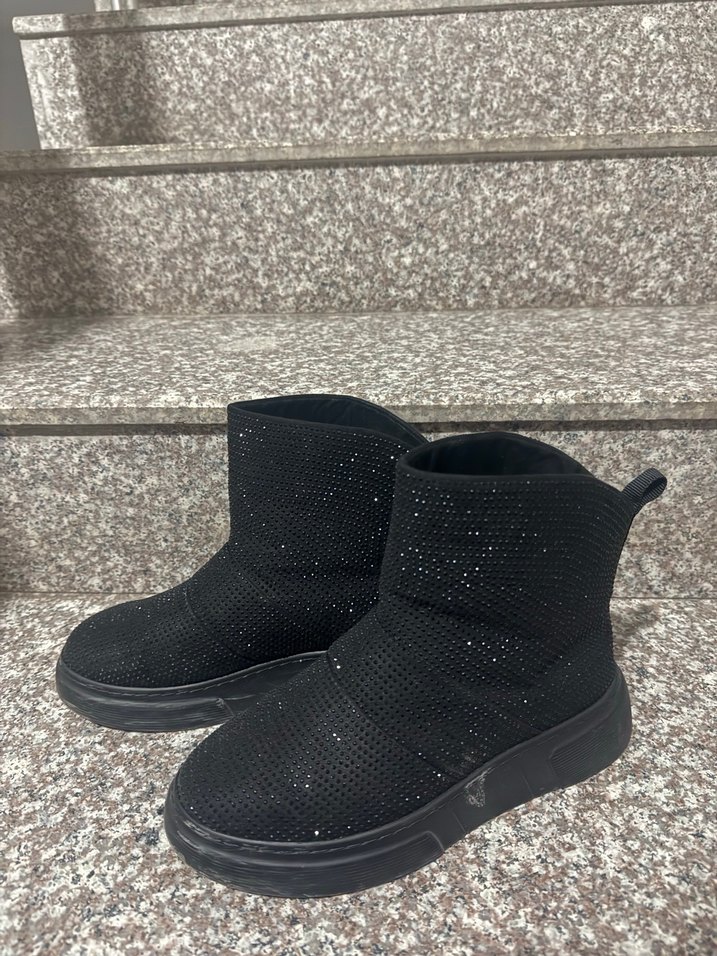 Siyah dolgu topuklu botlar, kauçuk tabanlı ve hafif pul detaylıdır. Trendy günlük sokak stili için rahat ve sıcak tasarım.