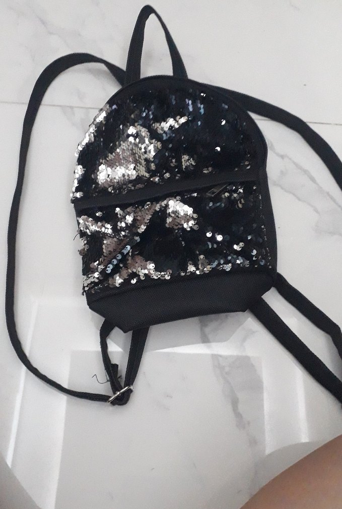 Siyah pul işlemeli sentetik kumaştan kadın sırt çantası, baskılı desene sahip. Sokak stili için uygun ve günlük kullanımda rahatlık sağlar. ön tarafında fermuar başı kırık, fotoğrafta görünmüyor pek