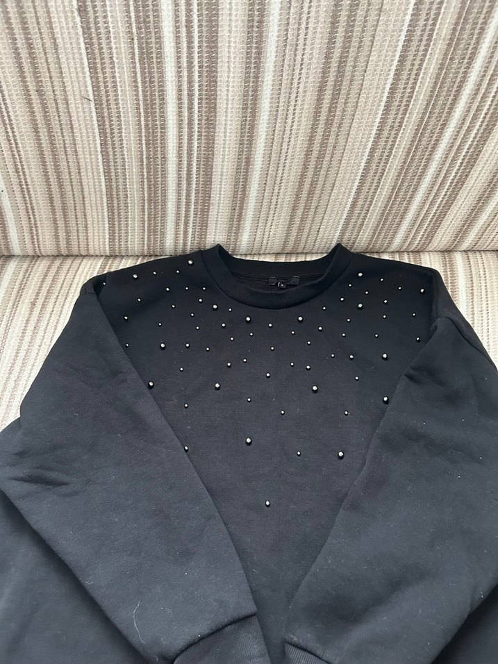 Siyah, uzun kollu, yuvarlak yaka, pul detaylı salaş kesim kadın sweatshirt. ✨