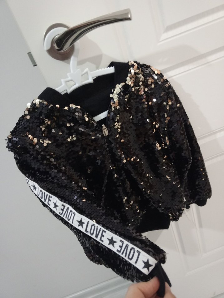 Siyah pul detaylı, kapüşonlu kız bolero. Uzun kollu, bol kesim ve 'LOVE' yazılı baskılı şerit ile süslenmiştir. ✨