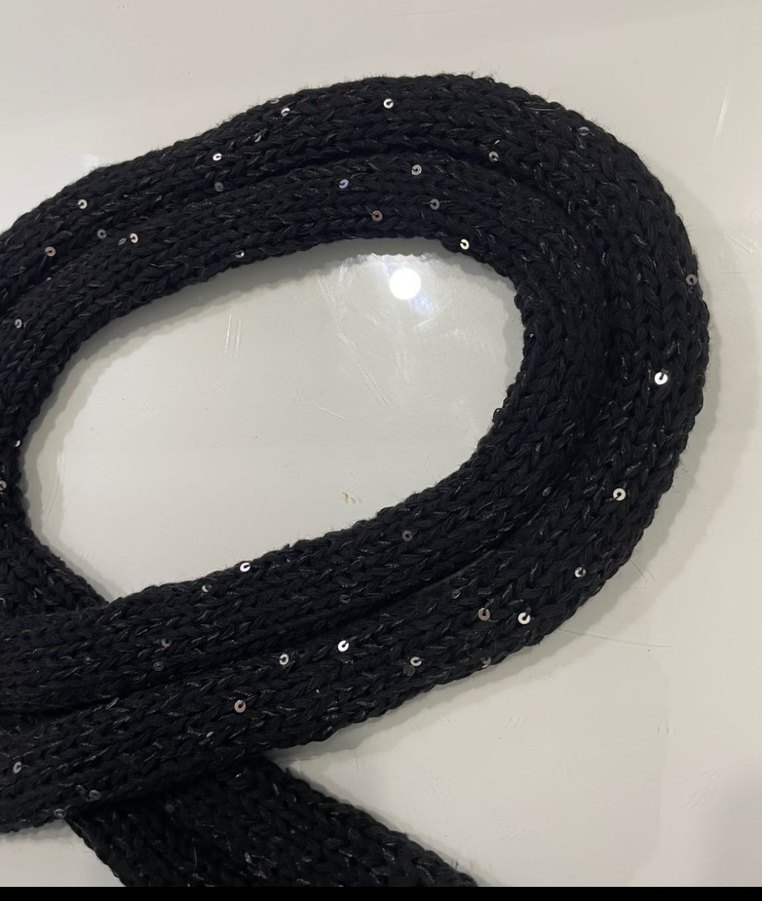 Siyah renkli, pul detaylı örgü kadın atkı, rahat dokusu ve gotik tarzıyla şık bir görünüm sunar.
