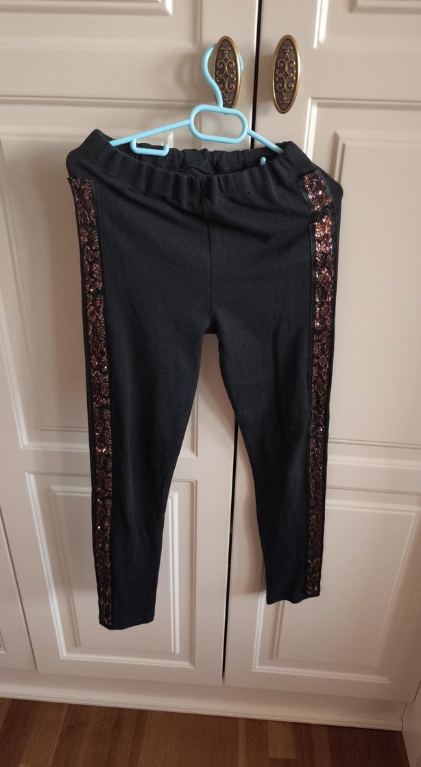 Siyah, pul detaylı yan şeritlere sahip, normal midi boyda, sentetik kumaştan yapılmış, dar kesim kadın tayt. ✨