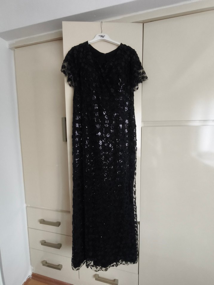 Siyah, kısa kollu ve V yakalı pul işlemeli uzun gotik abiye elbise. Fitted kesimiyle parti için uygun. ✨