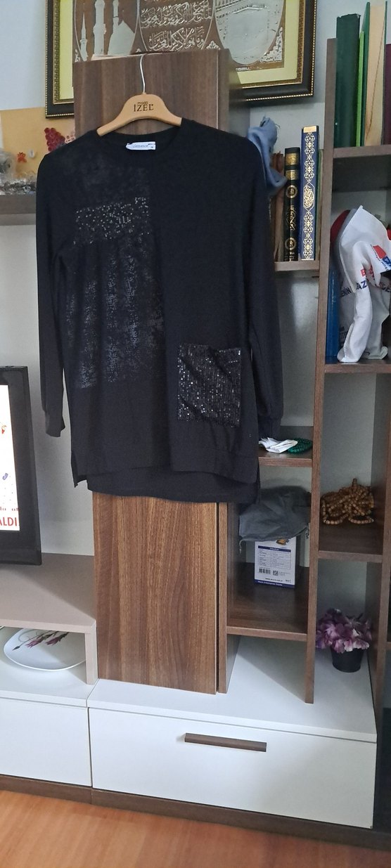 Siyah, uzun kollu, midi boyda ve bol kesim kadın tunik. Ön kısmında pul işlemeli cepler bulunur. Yumuşak sentetik kumaştan, günlük kullanıma uygun. ✨ GÖĞÜS 53 BOY 78