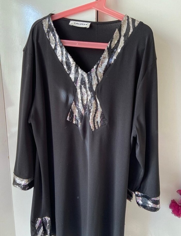 Siyah, V yaka, uzun ve bol kesim kadın bluz. Yaka, manşet ve etek ucunda pul işlemeli zebra desen detayları bulunur.