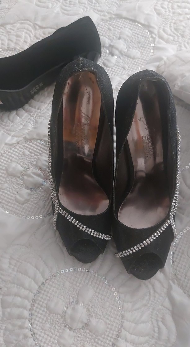 Siyah, pullu detaylı ve yılan desenli yüksek topuklu ayakkabılar, kauçuk malzemeden yapılmıştır, düğün gibi özel anlar için uygundur.