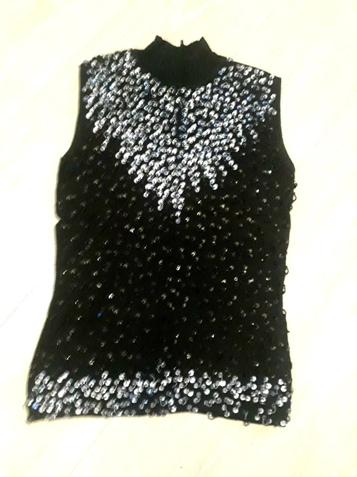 Siyah, pul işlemeli, yüksek yakalı ve kolsuz bu triko süveter, parti için uygun avant-garde tarzda şık bir görünüme sahiptir.
