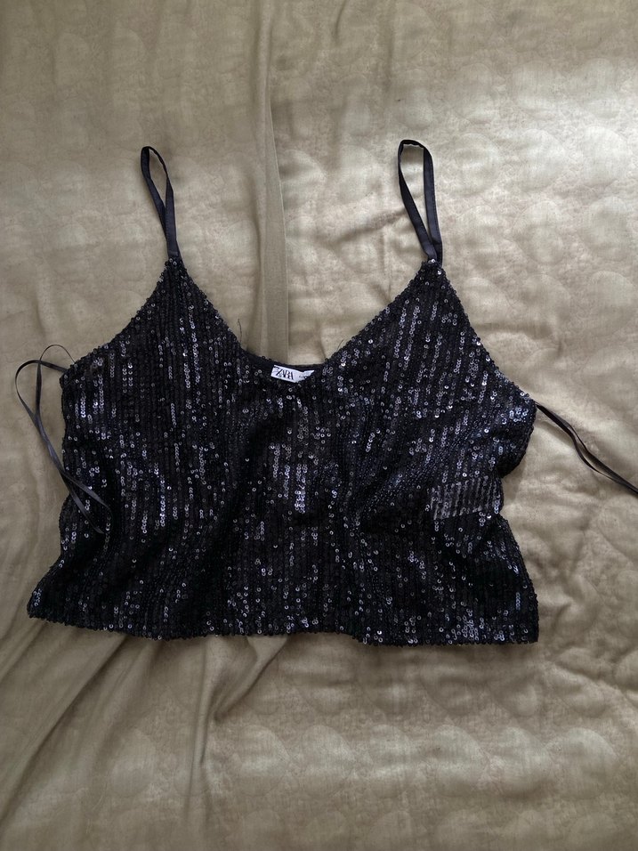 Siyah Pul Payetli V Yaka Mini Crop Top