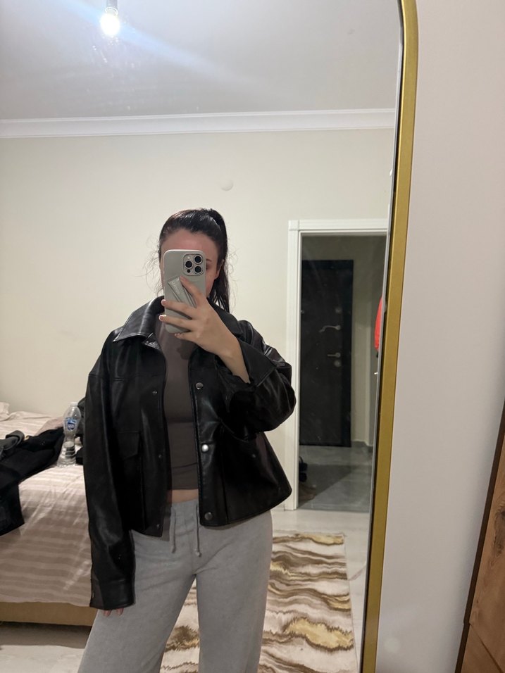Siyah deri ceket, yüksek yakalı ve uzun kollu, bol kesim. Bu sene alındı. 1 ya da 2 kere giyildi. Problemi yok.