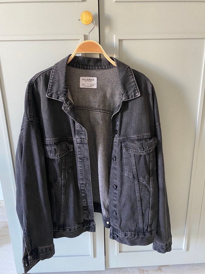 düğmeli, uzun kollu, bol kesim denim ceket, çok temiz ve defosuz, rengi yıkatılmış siyah, resimlerde gri gibi çıkmış