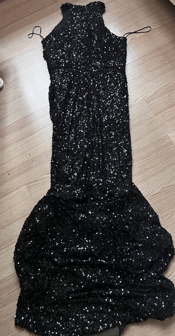 Siyah tek parça uzun abiye elbise, parlak pulla kaplı, tek düze ve boğaz kesimlidir. Bir defa kullanıldı.Parti için uygundur. ✨