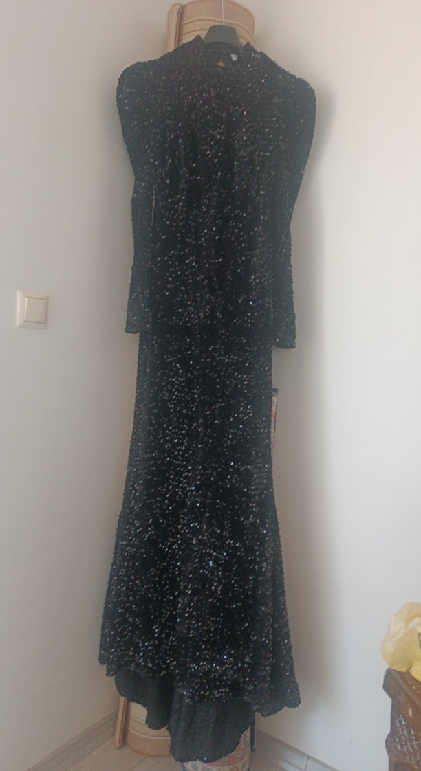 Siyah, pullu detaylara sahip, uzun kollu ve sirti acik vücuda oturan uzun abiye elbise. Parti için uygundur. bir kere giyildi, yurtdışından aldım ✨