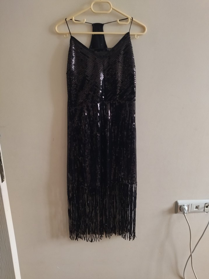 Siyah yılan desenli, straplez yaka ve uzun püskül detaylı, vücuda oturan abiye elbise, avant-garde parti tarzı için uygundur.