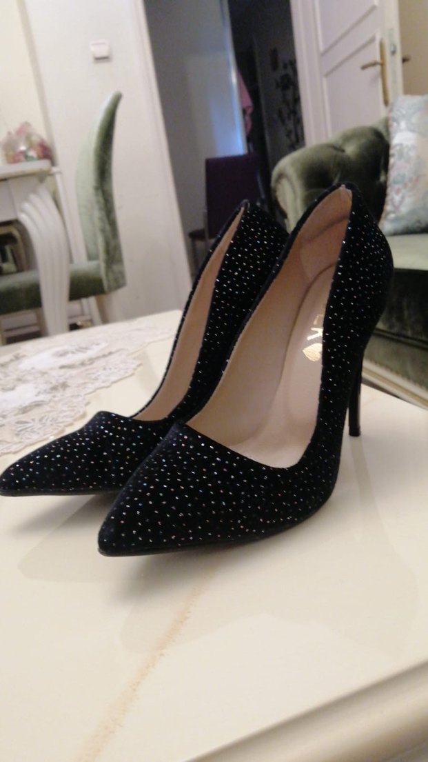 Siyah pullu stiletto topuklu ayakkabılar, ince yılan derisi deseniyle romantik ve gösterişli geceler için uygundur. Kauçuk taban rahatlık sağlar.