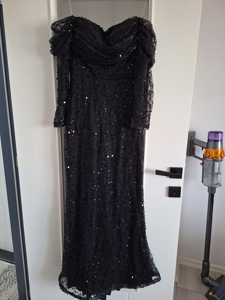 Siyah uzun gece elbisesi, drapeli detaylı ve vücuda oturan kesime sahip pullu taş boncuklu abiye mağazasından 4000 tl aldım sadece 2 defa giydim 3 saatlık giydim hiç bir sorumu yok sıfırdan farksız