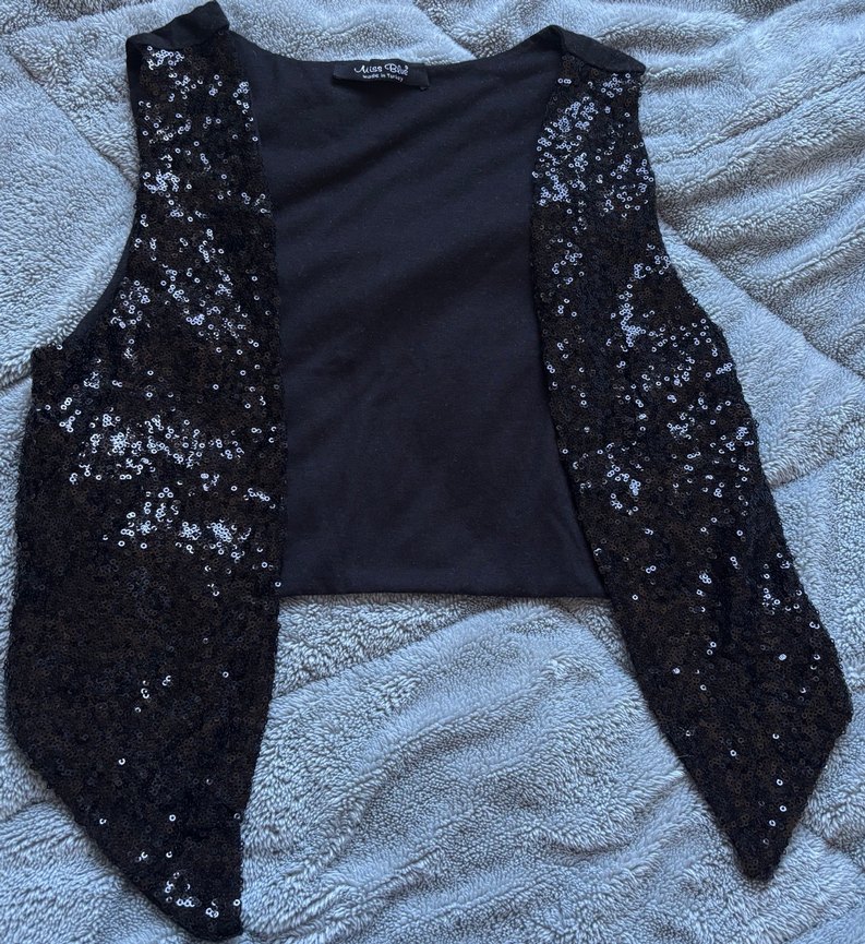 Sentetik kumaştan yapılmış, pul detaylı siyah yelek. V-yaka ve gotik tarzda, parti için uygun.