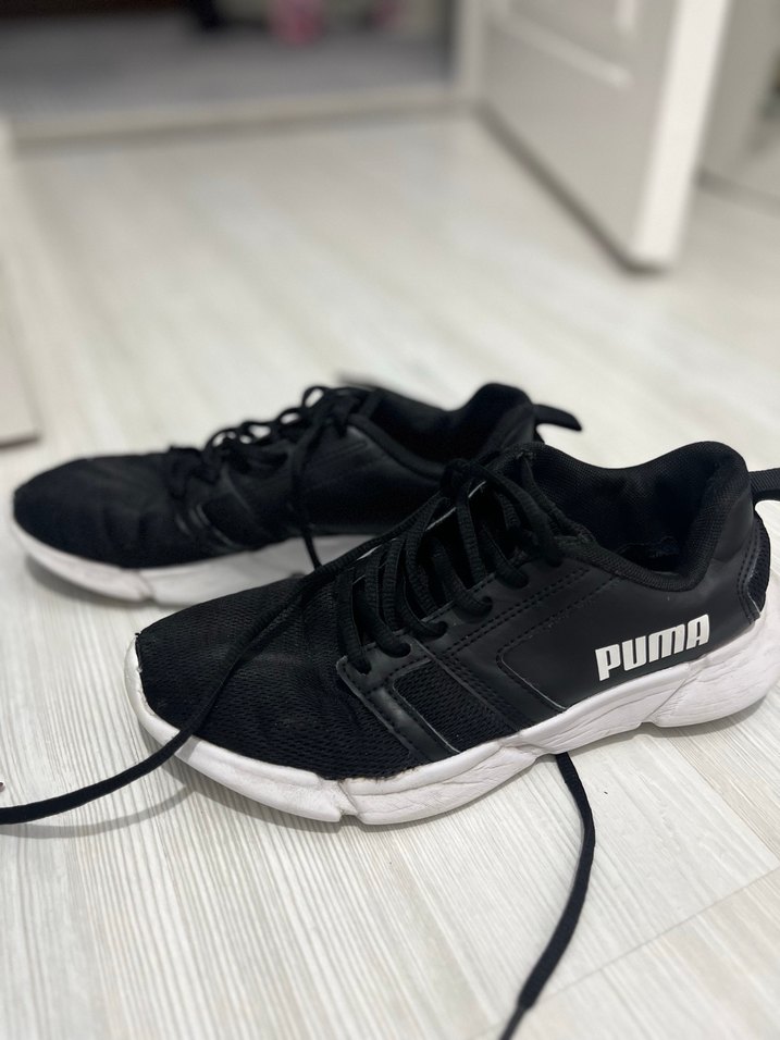Siyah Puma spor ayakkabı, bağcıklı tasarım ve kauçuk tabanlı. Spor ve sokak giyimine uygun, rahat ve trend bir model. Fotoğraftaki gibi bir ayakta parmak söküğü mevcut