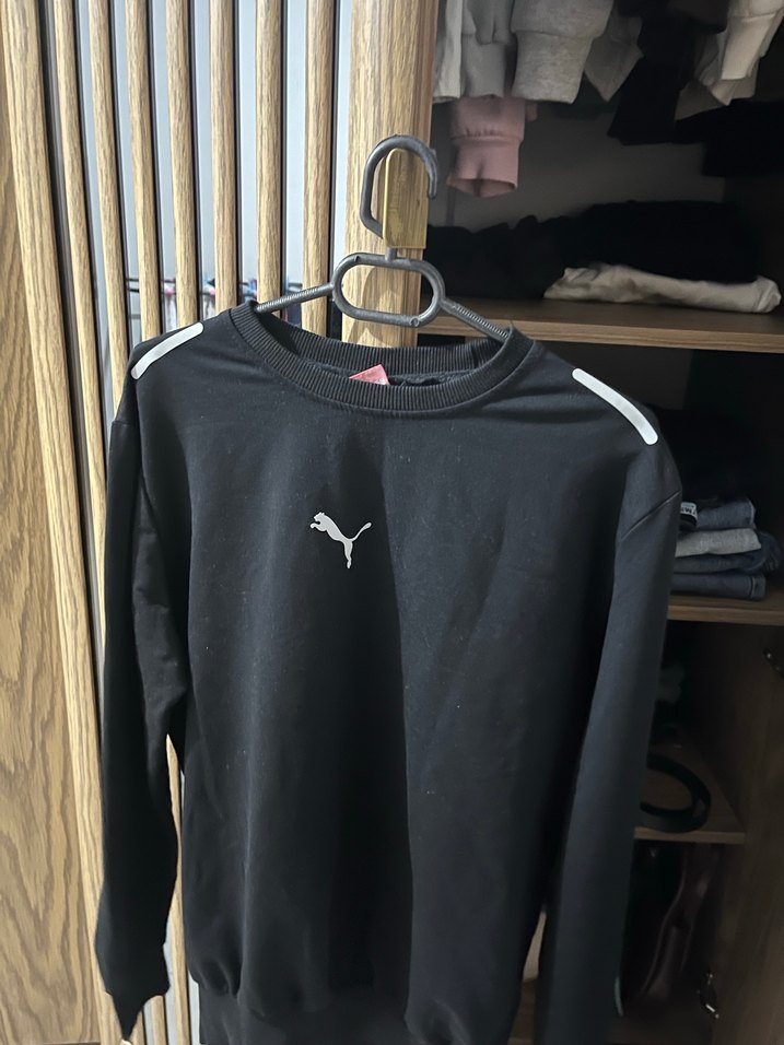 Siyah Puma sweatshirt, uzun kollu ve bisiklet yaka. Yumuşak fleece kumaştan, omuzlarda cırt cırt detaylı, normal midi boyda, sportif ve günlük kullanıma uygun.ürün dar kalıp bilginiz olsun