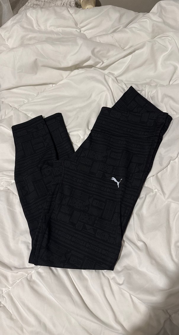 Elastik bel bantlı, hafif desenli siyah Puma tayt, midi boyda, spor ve günlük kullanım için uygun.