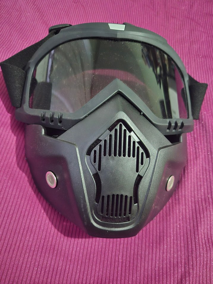 Dayanıklı plastikten yapılmış, bantlı ve siyah motosiklet kaskı. Koyu renk vizör ve havalandırmalı ön maskesiyle rock punk tarzına uygun. ️