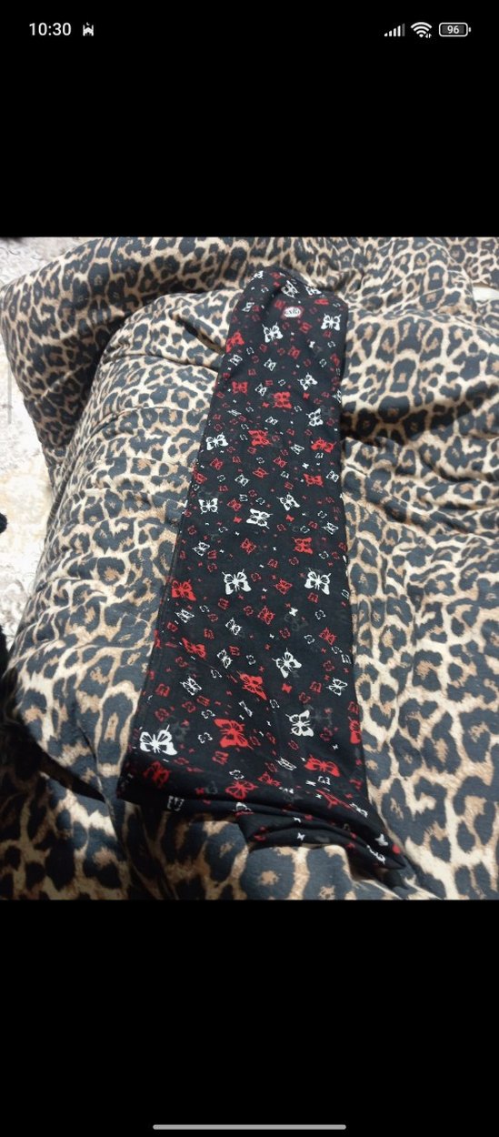 Siyah renkte, kırmızı ve beyaz desenli, sentetik kumaştan yapılmış,punk tarzı kadın şalıdır. Grunge punk ve bohem stillerine uygundur. Hafif nir çiziği vardır onun dışında başka bir şeyi yoktur.