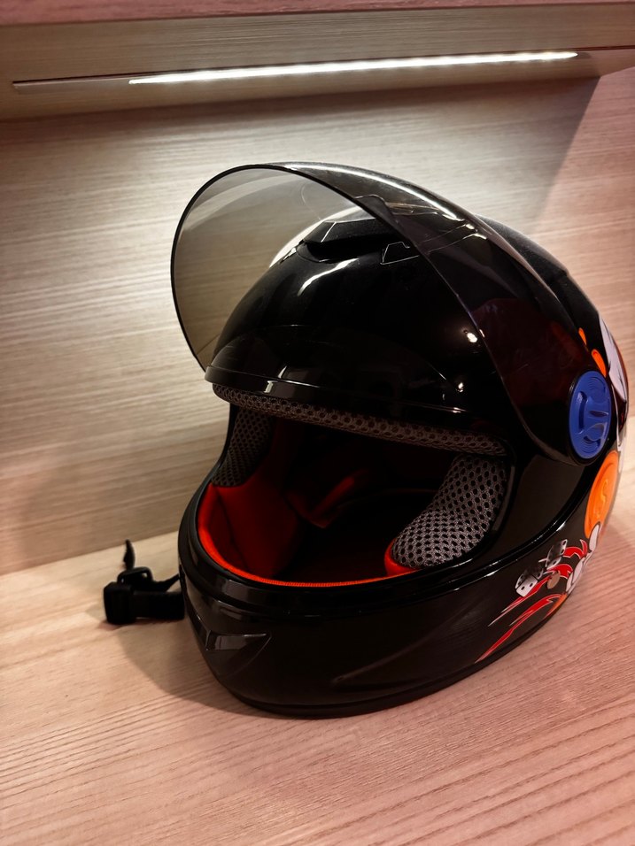 Siyah kemerli çocuk motosiklet kaskı, baskılı desenli ve yumuşak kürklü iç yüzeye sahip, grunge punk tarzını yansıtıyor. Yedi yaşa kadar uygun bi ürün. Sadece kapak kısmı tam oturmuyor diyebilirim