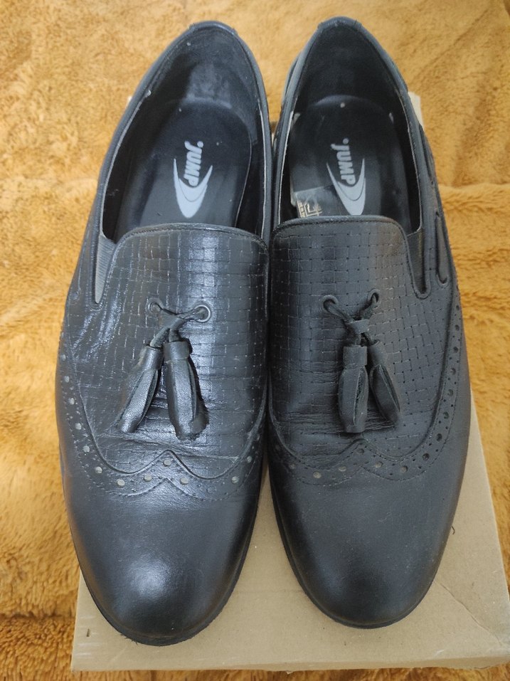Siyah parlak yüzeyli, püsküllü klasik erkek ayakkabısı. Kauçuk tabanlı, ofis kullanımı için uygun, desen içermeyen geleneksel tarzda.