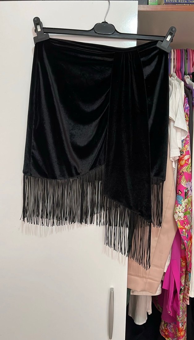 Siyah renkli, drapeli ve püsküllü kadın eteği yumuşak sentetik kumaştan üretilmiştir. Bohem ve gotik tarzlar için uygundur.