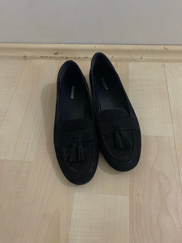Siyah renkli, kauçuk malzemeden yapılmış blok topuklu kadın loafer. Püskül detaylarıyla minimalist tasarım, günlük sokak stili için uygun.