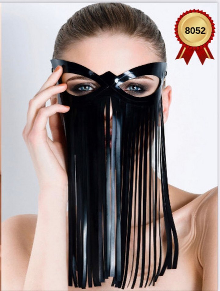 Uzun püsküllerle yüzün alt kısmını kapatan siyah parlak yüz maskesi, gözlerin üzerinde çapraz tasarıma sahip.