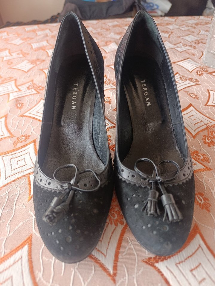 Siyah, desenli ve püsküllü detaylı kadın topuklu ayakkabı. Ofis için uygun, süet malzemeden, klasik ve zarif tasarım.