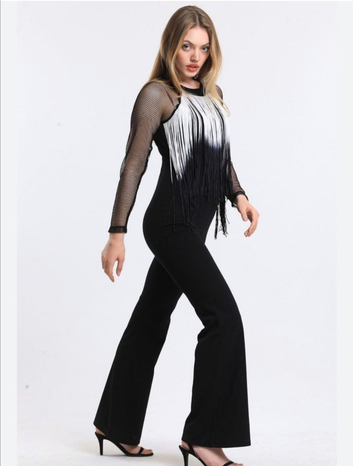 Siyah uzun tulum, straplez yakası, uzun file kollu ve püsküllü batik detaylarıyla çağdaş avant-garde tarz sunar, ofis kullanımı için uygundur.