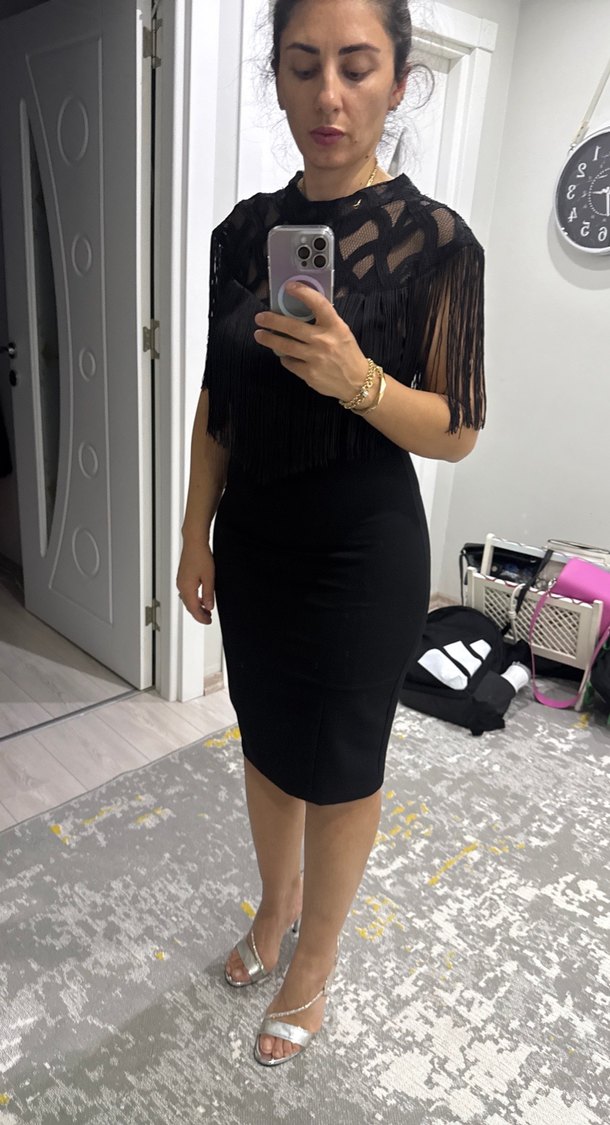 V yaka, püsküllü ve baskılı detaylara sahip, siyah, oturmalı midi elbise. Ofis için cesur ve şık bir tercih.