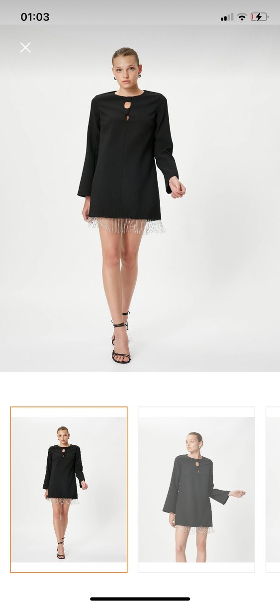 Siyah renk, V yaka ve püskül detaylı kısa, bol kesim elbise. Sentetik kumaştan, romantik akşamlar için uygundur.