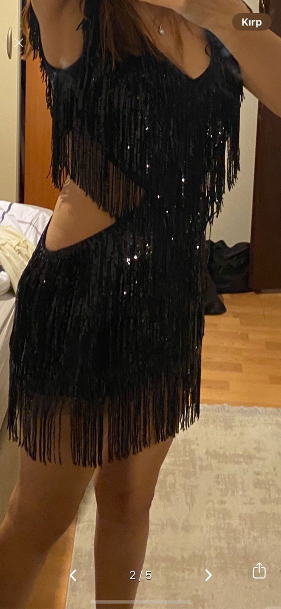 Siyah, v yaka ve ince askılı, püsküllerle süslenmiş, dar kesim mini gece elbisesi, cesur ve avant-garde tarz için ideal. Bir kere bır gecede gıydım yanları ben açtırdım Müthiş güzel bir elbise bir gece Lizbon’da bir gecede gıydım