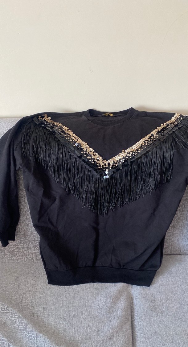 Siyah, süet dokulu, uzun kollu ve yuvarlak yakalı bol kesim sweatshirt. Nakışlı desenler ve püskül detaylarıyla bohem tarzı yansıtıyor. ✨