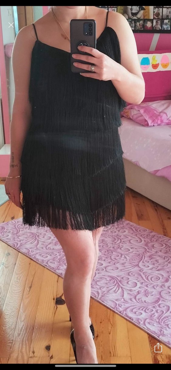 Siyah, straplez ve püsküllü mini elbise, sentetik kumaştan üretilmiş, bohem ve gotik tarzda, parti için uygun.