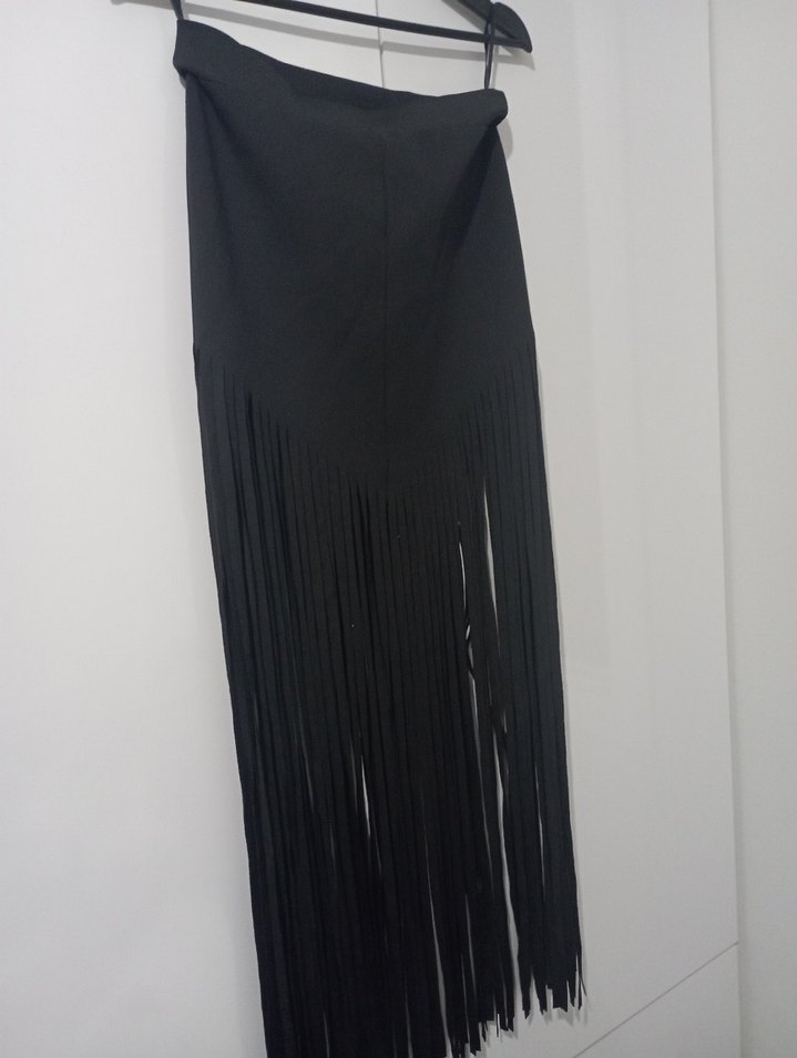 Püsküllü uçlarıyla siyah, uzun ve dar kesim etek. Yumuşak sentetik kumaştan yapılmış, gotik tarzda ve parti için uygun.